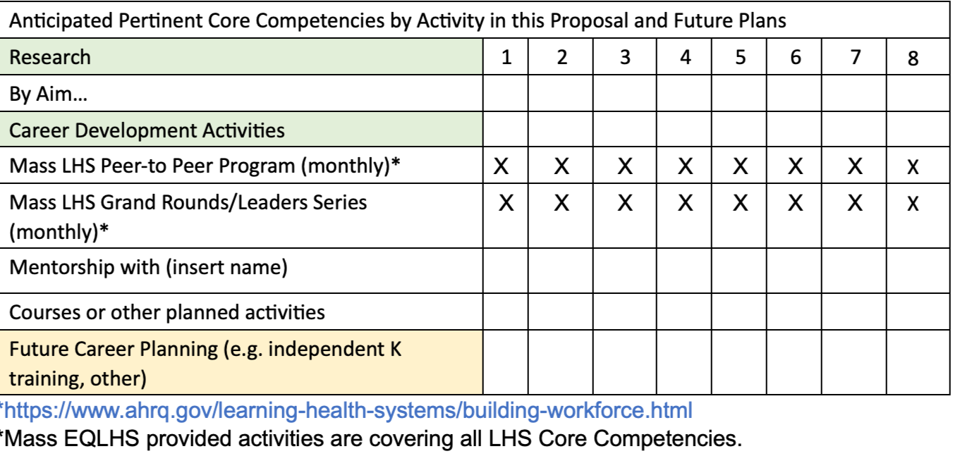 4. Career Development Plan: Outline the candidate’s career development plan and any training needed to achieve career goals. Please also include a mandatory table (see example below) demonstrating fulfillment of AHRQ LHS Core Competencies pertinent to candidate’s planned research career (https://www.ahrq.gov/learning-health-systems/building-workforce.html). The mandatory table will not count towards the 6-page limit.